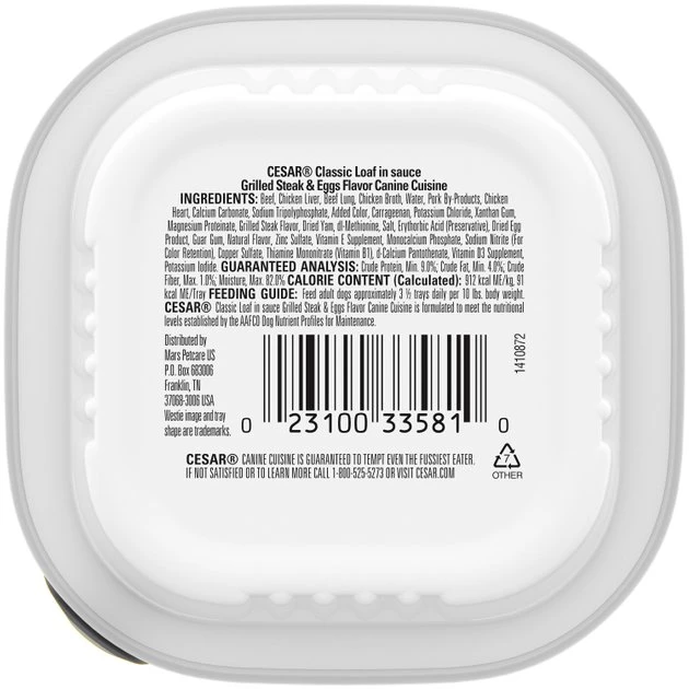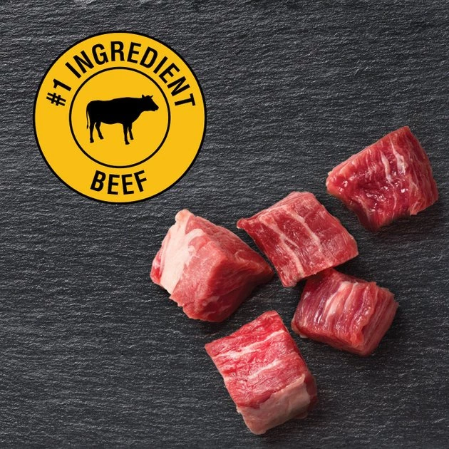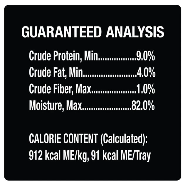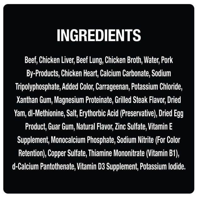 Beef, Chicken Liver, Beef Lung, Chicken Broth, Water, Pork By-Products, Chicken Heart, Calcium Carbonate, Sodium Tripolyphosphate, Added Color, Carrageenan, Potassium Chloride, Xanthan Gum, Magnesium Proteinate, Grilled Steak Flavor, Dried Yam, dl-Methionine, Salt, Erythorbic Acid (Preservative), Dried Egg Product, Guar Gum, Natural Flavor, Zinc Sulfate, Vitamin E Supplement, Monocalcium Phosphate, Sodium Nitrite (For Color Retention), Copper Sulfate, Thiamine Mononitrate (Vitamin B1), d-Calcium Pantothenate, Vitamin D3 Supplement, Potassium Iodide.