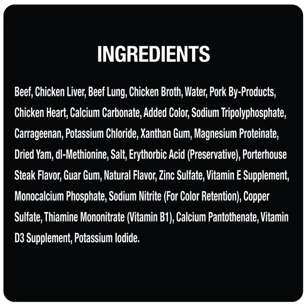 Beef, Chicken Liver, Beef Lung, Chicken Broth, Water, Pork By-Products, Chicken Heart, Calcium Carbonate, Added Color, Sodium Tripolyphosphate, Carrageenan, Potassium Chloride, Xanthan Gum, Magnesium Proteinate, Dried Yam, dl-Methionine, Salt, Erythorbic Acid (Preservative), Porterhouse Steak Flavor, Guar Gum, Natural Flavor, Zinc Sulfate, Vitamin E Supplement, Monocalcium Phosphate, Sodium Nitrite (For Color Retention), Copper Sulfate, Thiamine Mononitrate (Vitamin B1), Calcium Pantothenate, Vitamin D3 Supplement, Potassium Iodide.