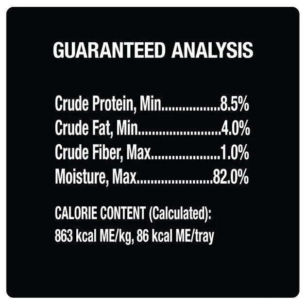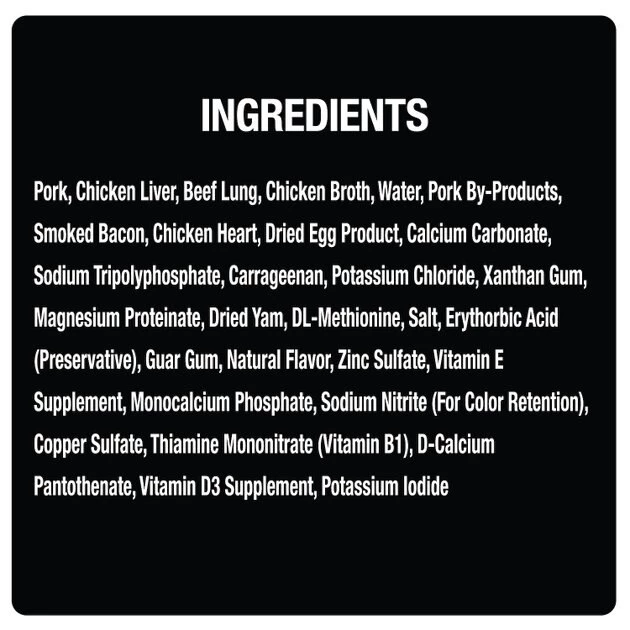 Pork, Chicken Liver, Beef Lung, Chicken Broth, Water, Pork By-Products, Smoked Bacon, Chicken Heart, Dried Egg Product, Calcium Carbonate, Sodium Tripolyphosphate, Carrageenan, Potassium Chloride, Xanthan Gum, Magnesium Proteinate, Dried Yam, DL-Methionine, Salt, Erythorbic Acid (Preservative), Guar Gum, Natural Flavor, Zinc Sulfate, Vitamin E Supplement, Monocalcium Phosphate, Sodium Nitrite (For Color Retention), Copper Sulfate, Thiamine Mononitrate (Vitamin B1), D-Calcium Pantothenate, Vitamin D3 Supplement, Potassium Iodide.