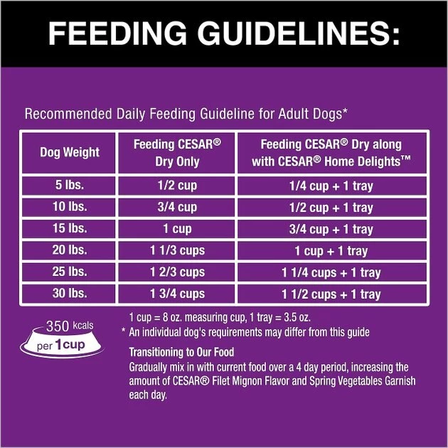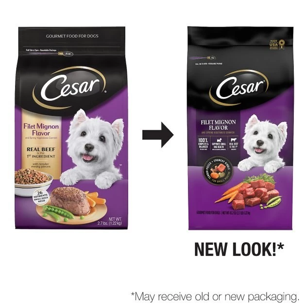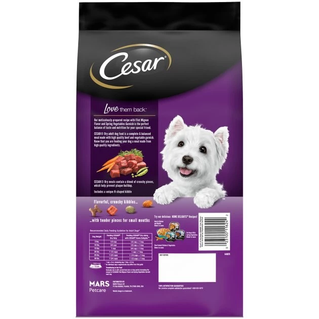 The Cesar Filet Mignon Flavor With Spring Vegetables Dry Dog Food puts taste and nutrition in one convenient bag. Made with high-quality meat as the first ingredient plus a garnish of spring veggies, it’s just the type of high-protein meal that your pup deserves. And with meaty, tender chunks throughout the crunchy kibble pieces, he’ll love the texture and variety, and you’ll love that he’s getting complete nutrition that’s packed with a whopping 26 nutrients for small dog needs.