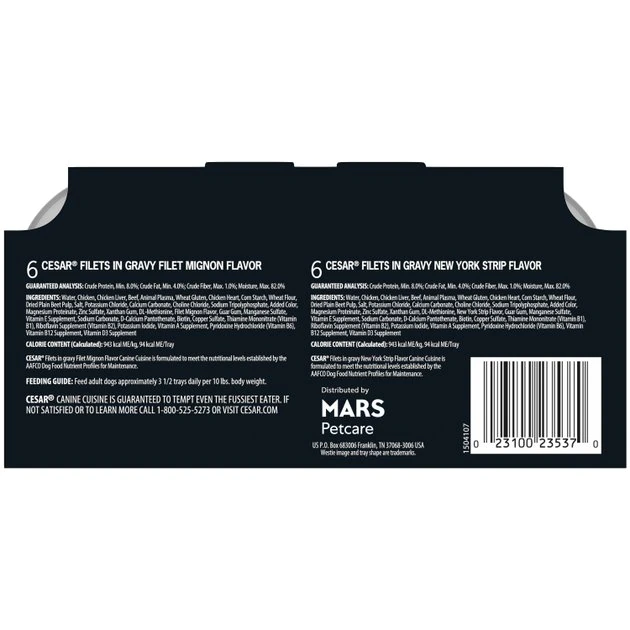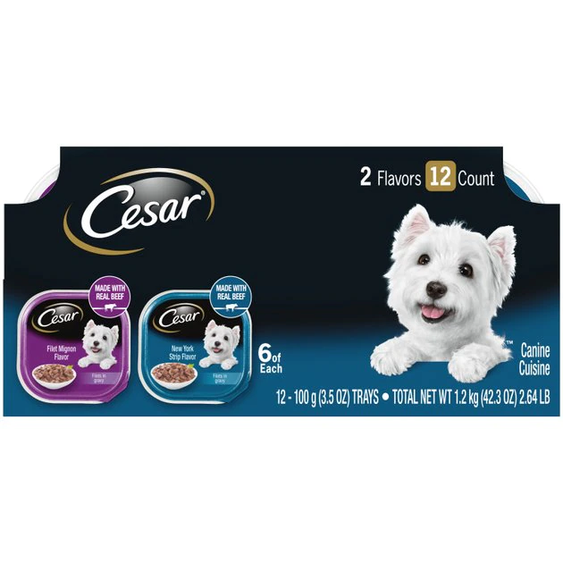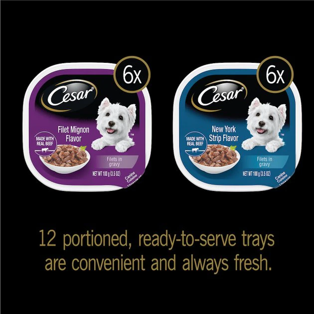 Dogs with sophisticated palates will love the variety of indulgent, rich flavors in the CESAR Adult Soft Wet Dog Food Filets in Gravy Variety Pack with amazing Filet Mignon and New York Strip Flavors. This culinary-inspired wet dog food is crafted with care to provide your dog with a delicious dinner and balanced nutrition. Made with real beef, each flavor is packed with meaty goodness. Plus, each flavor is fortified with vitamins and minerals to help dogs of all sizes feel paw-sitively great. You can serve it on its own, or add it as a delectable meal topper––either way, your dog will delight in this dish!