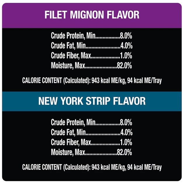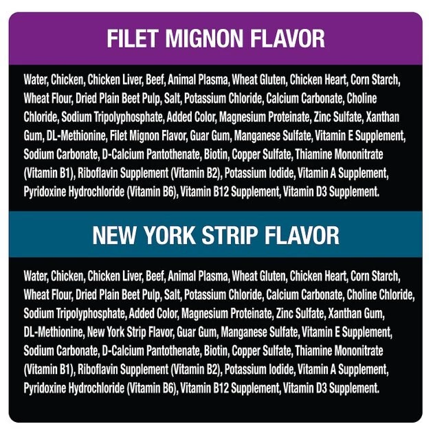New York Strip Flavor: Water, Chicken, Chicken Liver, Beef, Animal Plasma, Wheat Gluten, Chicken Heart, Corn Starch, Wheat Flour, Dried Plain Beet Pulp, Salt, Potassium Chloride, Calcium Carbonate, Choline Chloride, Sodium Tripolyphosphate, Added Color, Magnesium Proteinate, Zinc Sulfate, Xanthan Gum, DL-Methionine, New York Strip Flavor, Guar Gum, Manganese Sulfate, Vitamin E Supplement, Sodium Carbonate, D-Calcium Pantothenate, Biotin, Copper Sulfate, Thiamine Mononitrate (Vitamin B1), Riboflavin Supplement (Vitamin B2), Potassium Iodide, Vitamin A Supplement, Pyridoxine Hydrochloride (Vitamin B6), Vitamin B12 Supplement, Vitamin D3 Supplement.
