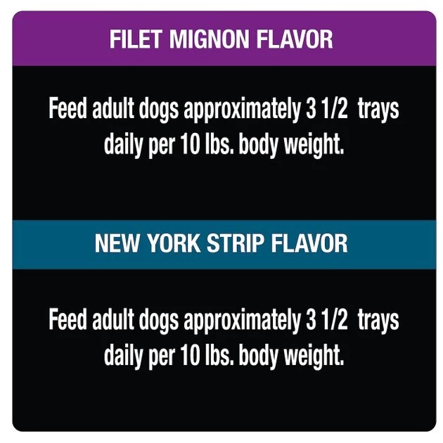 Feed adult dogs approximately 3 1/2 trays daily per 10 lbs. body weight.