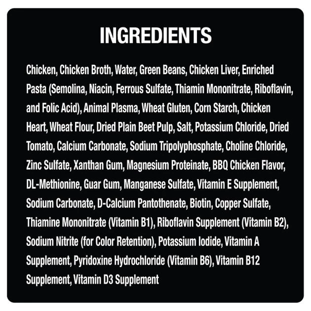 Chicken, Chicken Broth, Water, Green Beans, Chicken Liver, Enriched Pasta (Semolina, Niacin, Ferrous Sulfate, Thiamin Mononitrate, Riboflavin, and Folic Acid), Animal Plasma, Wheat Gluten, Corn Starch, Chicken Heart, Wheat Flour, Dried Plain Beet Pulp, Salt, Potassium Chloride, Dried Tomato, Calcium Carbonate, Sodium Tripolyphosphate, Choline Chloride, Zinc Sulfate, Xanthan Gum, Magnesium Proteinate, BBQ Chicken Flavor, DL-Methionine, Guar Gum, Manganese Sulfate, Vitamin E Supplement, Sodium Carbonate, D-Calcium Pantothenate, Biotin, Copper Sulfate, Thiamine Mononitrate (Vitamin B1), Riboflavin Supplement (Vitamin B2), Sodium Nitrite (for Color Retention), Potassium Iodide, Vitamin A Supplement, Pyridoxine Hydrochloride (Vitamin B6), Vitamin B12 Supplement, Vitamin D3 Supplement