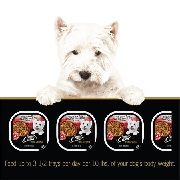 Your pooch won’t be able to get enough of the irresistible flavors of Cesar’s home Delights Adult BBQ Chicken Flavor With Green Beans & Orzo in Sauce Wet Dog Food. The main ingredient of this drool-worthy food is chicken, and it’s packed with a mouthwatering BBQ chicken flavor that your pup will love. It’s also formulated with vitamins of minerals for a meal that is nutritious and delicious—especially for your small dog! Simply serve this recipe atop your canine companion’s favorite kibble or by itself for a paw-some meal. Plus, each meal comes in paw-fectly portioned, peelable trays to help make mealtime simple!
