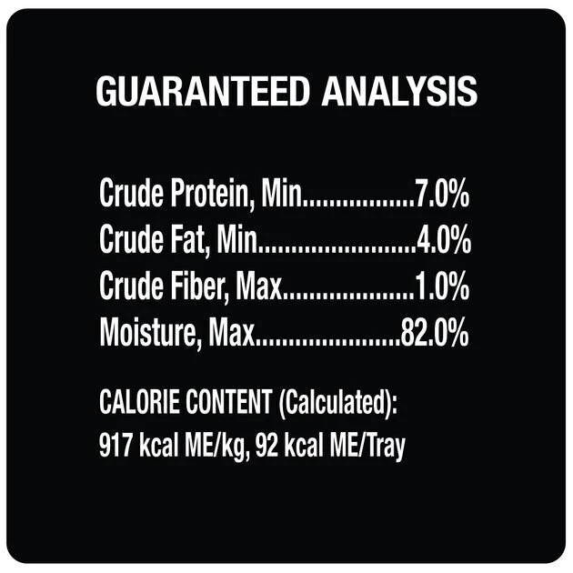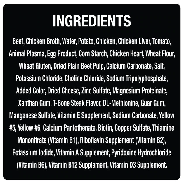 Beef, Chicken Broth, Water, Potato, Chicken, Chicken Liver, Tomato, Animal Plasma, Egg Product, Corn Starch, Chicken Heart, Wheat Flour, Wheat Gluten, Dried Plain Beet Pulp, Calcium Carbonate, Salt, Potassium Chloride, Choline Chloride, Sodium Tripolyphosphate, Added Color, Dried Cheese, Zinc Sulfate, Magnesium Proteinate, Xanthan Gum, T-Bone Steak Flavor, DL-Methionine, Guar Gum, Manganese Sulfate, Vitamin E Supplement, Sodium Carbonate, Yellow #5, Yellow #6, Calcium Pantothenate, Biotin, Copper Sulfate, Thiamine Mononitrate (Vitamin B1), Riboflavin Supplement (Vitamin B2), Potassium Iodide, Vitamin A Supplement, Pyridoxine Hydrochloride (Vitamin B6), Vitamin B12 Supplement, Vitamin D3 Supplement.