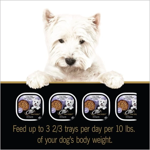 - Contains 24 3.5-oz. trays of Cesar Home Delights Wet Dog Food T-Bone Steak, Egg & Cheese Flavor with Potatoes in Sauce.