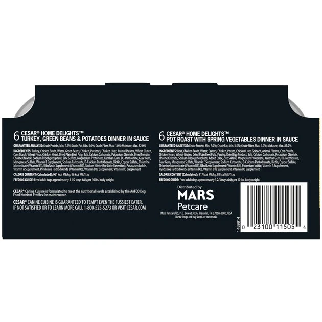 Cesar Home Delights Turkey, Green Beans & Potatoes Dinner and Pot Roast With Spring Vegetables Dinner Dog Food Trays Variety Pack lets your pooch pick his favorite. Perfect for small to large dogs, the gourmet taste and smell will delight even the pickiest of pals. These formulas are enhanced with vitamins and minerals, which means every single-serve tray is part of a balanced and complete diet. They’re perfect to serve your pawtner as a meal on their own or as a delicious dry food topper. Plus, the convenient trays have easy peel-away freshness seals to make mealtime a snap.