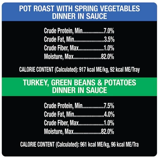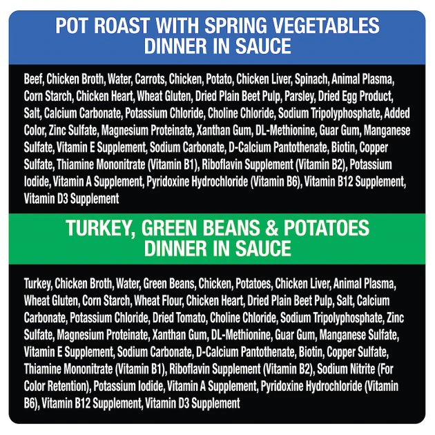Pot Roast with Spring Vegetables: Beef, Chicken Broth, Water, Carrots, Chicken, Potato, Chicken Liver, Spinach, Animal Plasma, Corn Starch, Chicken Heart, Wheat Gluten, Dried Plain Beet Pulp, Parsley, Dried Egg Product, Salt, Calcium Carbonate, Potassium Chloride, Choline Chloride, Sodium Tripolyphosphate, Added Color, Zinc Sulfate, Magnesium Proteinate, Xanthan Gum, DL-Methionine, Guar Gum, Manganese Sulfate, Vitamin E Supplement, Sodium Carbonate, D-Calcium Pantothenate, Biotin, Copper Sulfate, Thiamine Mononitrate (Vitamin B1), Riboflavin Supplement (Vitamin B2), Potassium Iodide, Vitamin A Supplement, Pyridoxine Hydrochloride (Vitamin B6), Vitamin B12 Supplement, Vitamin D3 Supplement.