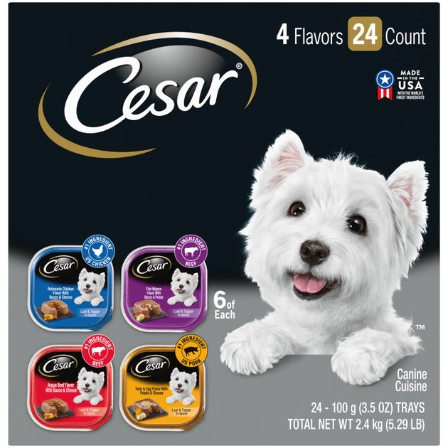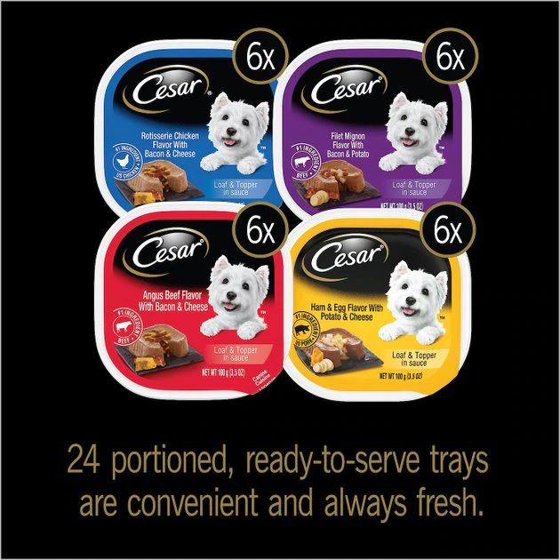 Give your foodie pup a hi-brow treat with Cesar Adult Wet Dog Food, which features US Beef, US Chicken or US Pork as the #1 ingredient. Perfect for large or small dogs, the gourmet rotisserie chicken, filet mignon, angus beef, and ham & egg flavors and smells will delight even the pickiest of pals. Cesar Dog Food treats your pup to a delicious classic loaf in sauce texture. These formulas are enhanced with vitamins and minerals, which means every single-serve tray is part of a balanced and complete diet. They’re perfect to serve your pal as a meal on their own or as a delicious dry food topper. Plus, the convenient trays have easy peel-away freshness seals to make mealtime a snap.