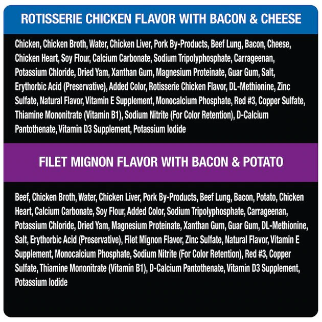 Filet Mignon Flavor with Bacon & Potato: Beef, Chicken Broth, Water, Chicken Liver, Pork By-Products, Beef Lung, Bacon, Potato, Chicken Heart, Calcium Carbonate, Soy Flour, Added Color, Sodium Tripolyphosphate, Carrageenan, Potassium Chloride, Dried Yam, Magnesium Proteinate, Xanthan Gum, Guar Gum, DL-Methionine, Salt, Erythorbic Acid (Preservative), Filet Mignon Flavor, Zinc Sulfate, Natural Flavor, Vitamin E Supplement, Monocalcium Phosphate, Sodium Nitrite (For Color Retention), Red #3, Copper Sulfate, Thiamine Mononitrate (Vitamin B1), D-Calcium Pantothenate, Vitamin D3 Supplement, Potassium Iodide.