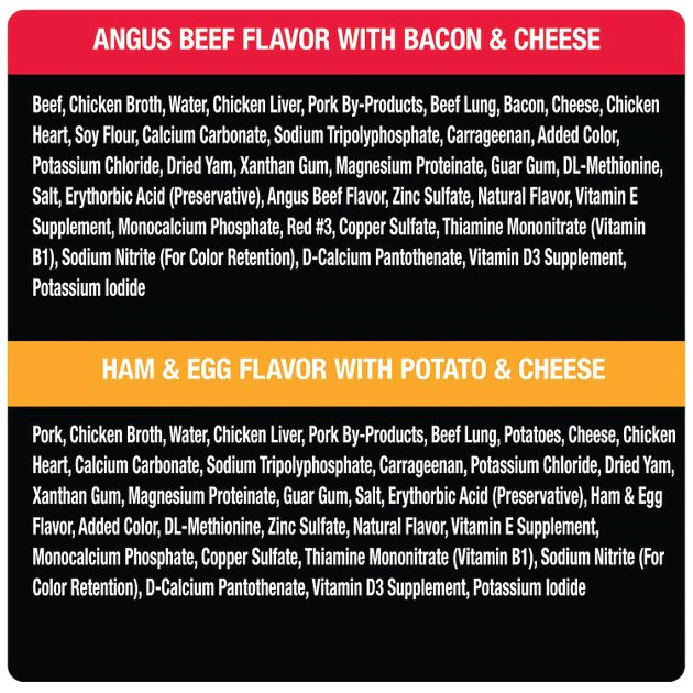 Angus Beef Flavor with Bacon & Cheese: Beef, Chicken Broth, Water, Chicken Liver, Pork By-Products, Beef Lung, Bacon, Cheese, Chicken Heart, Soy Flour, Calcium Carbonate, Sodium Tripolyphosphate, Carrageenan, Added Color, Potassium Chloride, Dried Yam, Xanthan Gum, Magnesium Proteinate, Guar Gum, DL-Methionine, Salt, Erythorbic Acid (Preservative), Angus Beef Flavor, Zinc Sulfate, Natural Flavor, Vitamin E Supplement, Monocalcium Phosphate, Red #3, Copper Sulfate, Thiamine Mononitrate (Vitamin B1), Sodium Nitrite (For Color Retention), D-Calcium Pantothenate, Vitamin D3 Supplement, Potassium Iodide.