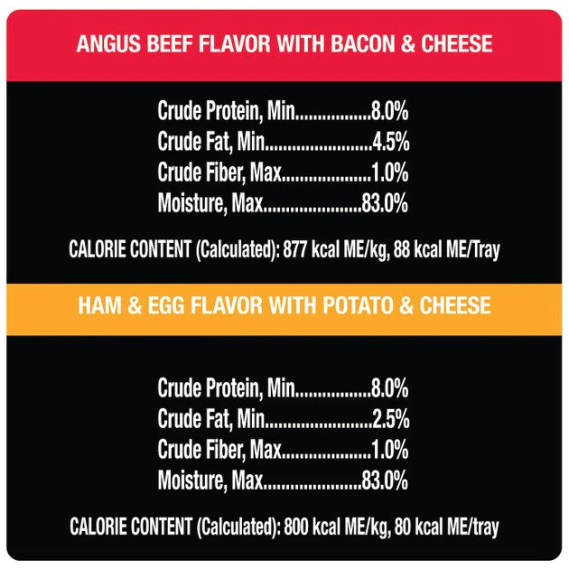 Angus Beef Flavor with Bacon & Cheese: 877 kcal/kg, 88 kcal/tray