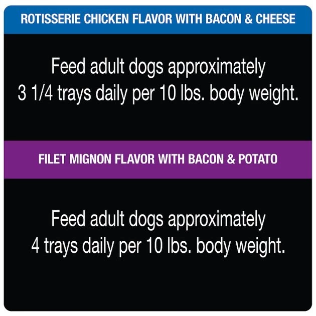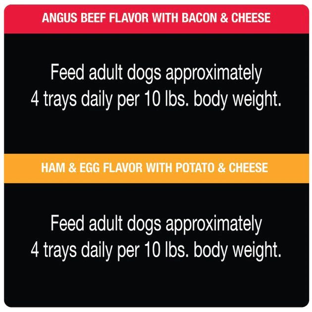 Angus Beef Flavor With Bacon & Cheese: Feed adult dogs approximately 4 trays daily per 10 lbs. body weight.