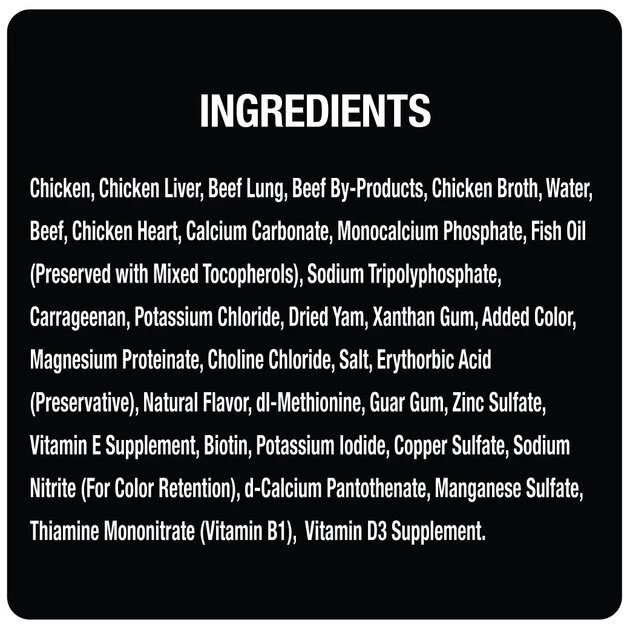 Chicken, Chicken Liver, Beef Lung, Beef By-Products, Chicken Broth, Water, Beef, Chicken Heart, Calcium Carbonate, Monocalcium Phosphate, Fish Oil (Preserved with Mixed Tocopherols), Sodium Tripolyphosphate, Carrageenan, Potassium Chloride, Dried Yam, Xanthan Gum, Added Color, Magnesium Proteinate, Choline Chloride, Salt, Erythorbic Acid (Preservative), Natural Flavor, dl-Methionine, Guar Gum, Zinc Sulfate, Vitamin E Supplement, Biotin, Potassium Iodide, Copper Sulfate, Sodium Nitrite (For Color Retention), d-Calcium Pantothenate, Manganese Sulfate, Thiamine Mononitrate (Vitamin B1), Vitamin D3 Supplement.