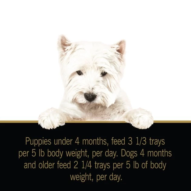 Dogs 4 months and older feed 2 1/4 trays per 5 lb of body weight, per day.