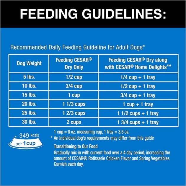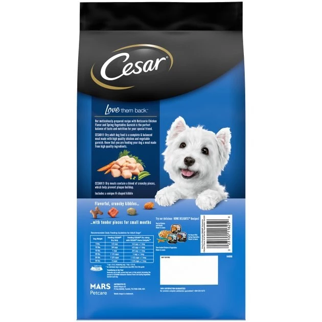 The Cesar Filet Chicken Flavor With Spring Vegetables Dry Dog Food puts taste and nutrition in one convenient bag. Made with high-quality meat as the first ingredient plus a garnish of spring veggies, it’s just the type of high-protein meal your pup deserves. And with meaty, tender chunks throughout the crunchy kibble pieces, he’ll love the texture and variety, and you’ll love that he’s getting complete nutrition that’s packed with a whopping 26 nutrients for small dog needs.