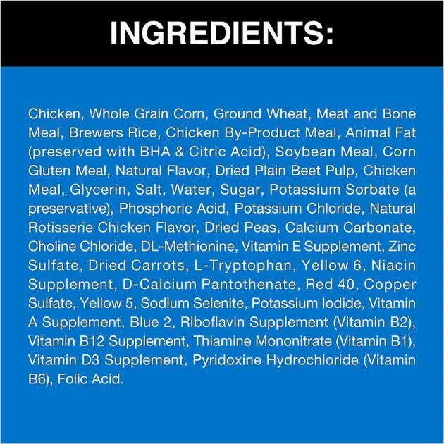 New: Chicken, Whole Grain Corn, Ground Wheat, Meat and Bone Meal, Brewers Rice, Chicken By-Product Meal, Animal Fat (preserved with BHA & Citric Acid), Soybean Meal, Corn Gluten Meal, Natural Flavor, Dried Plain Beet Pulp, Chicken Meal, Glycerin, Salt, Water, Sugar, Potassium Sorbate (a preservative), Phosphoric Acid, Potassium Chloride, Natural Rotisserie Chicken Flavor, Dried Peas, Calcium Carbonate, Choline Chloride, DL-Methionine, Vitamin E Supplement, Zinc Sulfate, Dried Carrots, L-Tryptophan, Yellow 6, Niacin Supplement, D-Calcium Pantothenate, Red 40, Copper Sulfate, Yellow 5, Sodium Selenite, Potassium Iodide, Vitamin A Supplement, Blue 2, Riboflavin Supplement (Vitamin B2), Vitamin B12 Supplement, Thiamine Mononitrate (Vitamin B1), Vitamin D3 Supplement, Pyridoxine Hydrochloride (Vitamin B6), Folic Acid.
