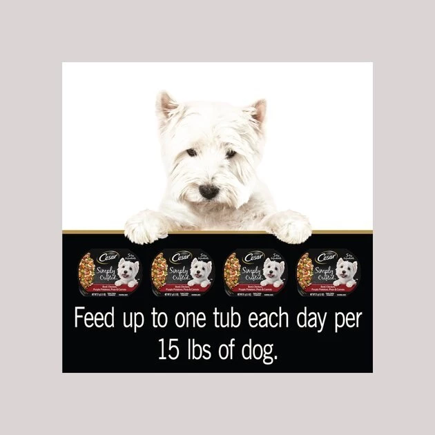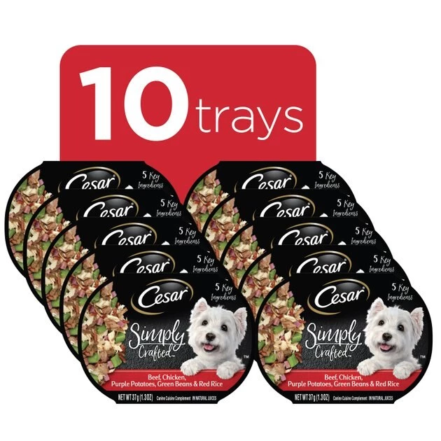 This Cesar Simply Crafted Meal Topper is the paw-fect way to add a blast of meaty flavor to your furry friend’s food! Featuring a super enticing combination of beef, chicken, purple potatoes, peas, and carrots, this mix-in is a great addition to any balanced doggy dinner. You can feel confident choosing this five-ingredient recipe for your pal—it contains no artificial preservatives, colors, flavors, or fillers. On top of that, the easy-open tubs seal in freshness and flavor, while helping simplify prep. Add some more savory goodness to your amigo’s entrée with a Cesar Simply Crafted Topper!