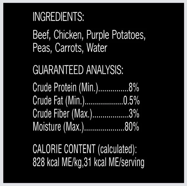 Beef, Chicken, Purple Potatoes, Peas, Carrots, Water
