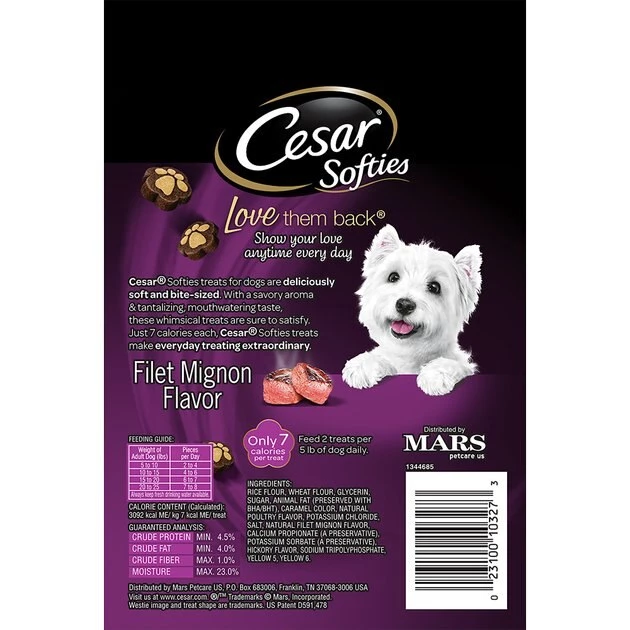 Your four-legged friend will feel extra special when you reward him with Cesar Softies Filet Mignon Dog Treats. He gives you love every day and you can love him back with these chewy, flavorful treats that are perfect for learning a new trick or for simply being his adorable self. Delectably soft and conveniently bite-sized, he’ll come running as soon as he hears you grab the bag. That delicious aroma and taste will leave him licking his lips for more, and with only seven calories per treat, it’s OK to indulge a little in these savory morsels.