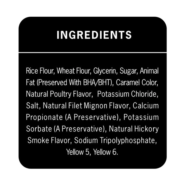 Rice Flour, Wheat Flour, Sugar, Glycerin, Propylene Glycol, Animal Fat (Preserved with BHA/Bht), Caramel Color, Natural Poultry Flavor, Potassium Chloride, Salt, Natural Filet Mignon Flavor, Calcium Propionate (a Preservative), Potassium Sorbate (a Preservative), Hickory Flavor, Artificial Color, Sodium Tripolyphosphate, Titanium Dioxide.