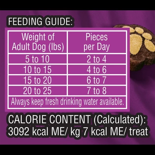 Feed 2 treats per 5 lb of dog daily. Provide fresh drinking water at all times.