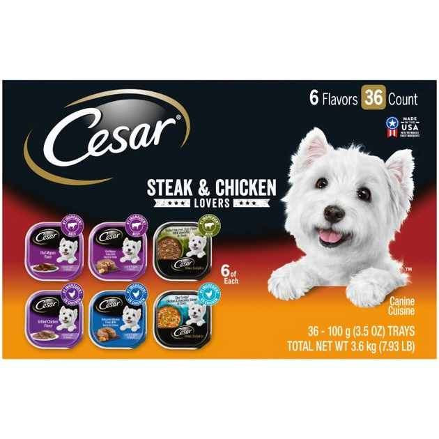 Does your pampered pooch crave a little variety in his diet? Even pups with the most sophisticated palates can enjoy some varied fine dining with Cesar’s Steak & Poultry Lovers Variety Pack Dog Food Trays. Featuring US beef or US chicken as the number one ingredient, flavors that include Filet Mignon, Grilled New York Strip, Grilled Chicken, Rotisserie Chicken and Slow Cooked Chicken & Vegetables will make their mouths water and tails wag. This delectable doggie treat delights and is enhanced with vitamins and minerals for complete and balanced nutrition. Plus, mealtime is made easier with Cesar’s convenient trays and no-fuss, peel-away freshness seals. No matter the size or breed, your dog is sure to love this gourmet dog food as a standalone meal or as a delicious dry food topper.