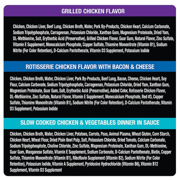 Rotisserie Chicken Flavor with Bacon & Cheese: Chicken, Chicken Broth, Water, Chicken Liver, Pork By-Products, Beef Lung, Bacon, Cheese, Chicken Heart, Soy Flour, Calcium Carbonate, Sodium Tripolyphosphate, Carrageenan, Potassium Chloride, Dried Yam, Xanthan Gum, Magnesium Proteinate, Guar Gum, Salt, Erythorbic Acid (Preservative), Added Color, Rotisserie Chicken Flavor, DL-Methionine, Zinc Sulfate, Natural Flavor, Vitamin E Supplement, Monocalcium Phosphate, Red #3, Copper Sulfate, Thiamine Mononitrate (Vitamin B1), Sodium Nitrite (For Color Retention), D-Calcium Pantothenate, Vitamin D3 Supplement, Potassium Iodide.