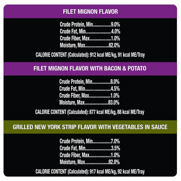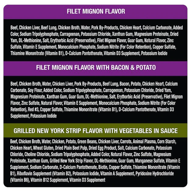 Grilled New York Strip Flavor with Vegetables in Sauce: Beef, Chicken Broth, Water, Chicken, Potato, Green Beans, Chicken Liver, Carrots, Animal Plasma, Corn Starch, Chicken Heart, Wheat Gluten, Dried Plain Beet Pulp, Dried Egg Product, Salt, Calcium Carbonate, Potassium Chloride, Choline Chloride, Sodium Tripolyphosphate, Added Color, Natural Flavor, Zinc Sulfate, Magnesium Proteinate, Xanthan Gum, Grilled New York Strip Flavor, DL-Methionine, Guar Gum, Manganese Sulfate, Vitamin E Supplement, Sodium Carbonate, D-Calcium Pantothenate, Biotin, Copper Sulfate, Thiamine Mononitrate (Vitamin B1), Riboflavin Supplement (Vitamin B2), Potassium Iodide, Vitamin A Supplement, Pyridoxine Hydrochloride (Vitamin B6), Vitamin B12 Supplement, Vitamin D3 Supplement.
