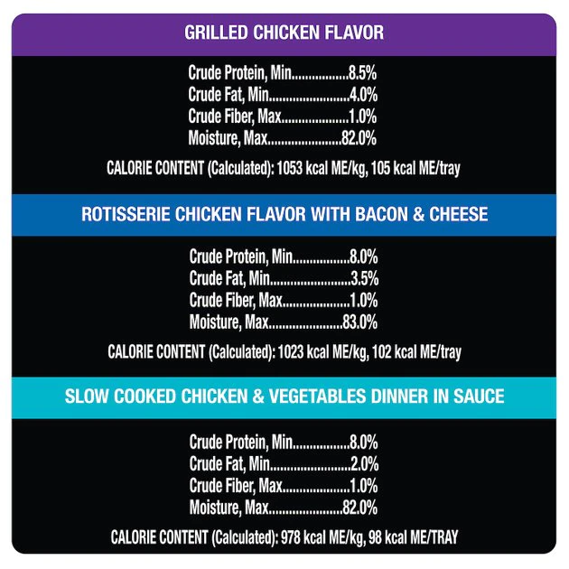 Rotisserie Chicken Flavor with Bacon & Cheese: 1023 kcal/kg, 102 kcal/tray