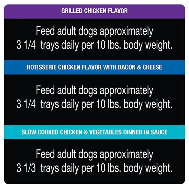 Grilled Chicken Flavor: Feed adult dogs approximately 3 1/4 trays daily per 10 lbs. body weight.