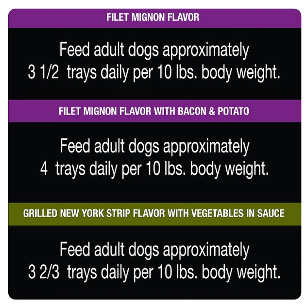 Filet Mignon Flavor: Feed adult dogs approximately 3 1/2 trays daily per 10 lbs. body weight.