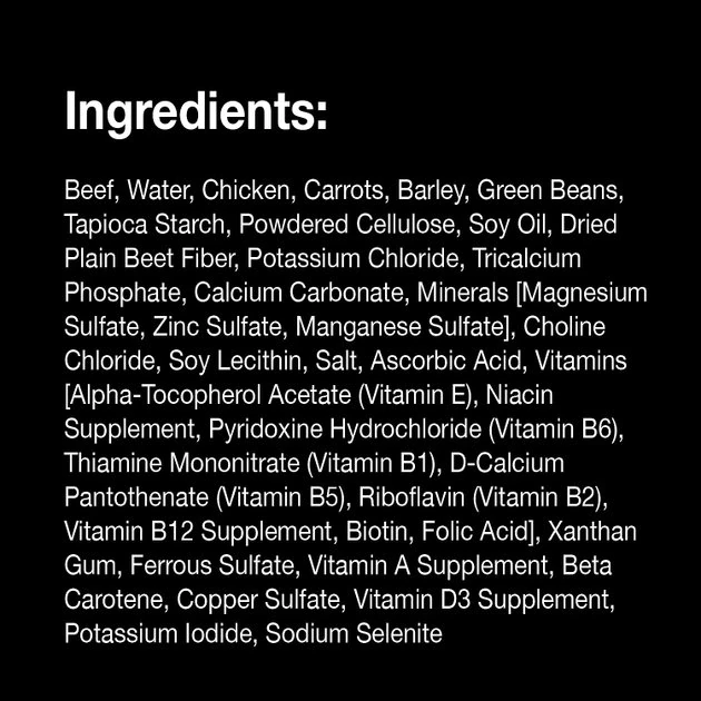 Beef, Water, Chicken, Carrots, Barley, Green Beans, Tapioca Starch, Powdered Cellulose, Soy Oil, Dried Plain Beet Fiber, Potassium Chloride, Tricalcium Phosphate, Calcium Carbonate, Minerals [Magnesium Sulfate, Zinc Sulfate, Manganese Sulfate], Choline Chloride, Soy Lecithin, Salt, Ascorbic Acid, Vitamins [Alpha-Tocopherol Acetate (Vitamin E), Niacin Supplement, Pyridoxine Hydrochloride (Vitamin B6), Thiamine Mononitrate (Vitamin B1), D-Calcium Pantothenate (Vitamin B5), Riboflavin (Vitamin B2), Vitamin B12 Supplement, Biotin, Folic Acid], Xanthan Gum, Ferrous Sulfate, Vitamin A Supplement, Beta Carotene, Copper Sulfate, Vitamin D3 Supplement, Sodium Selenite, Potassium Iodide.